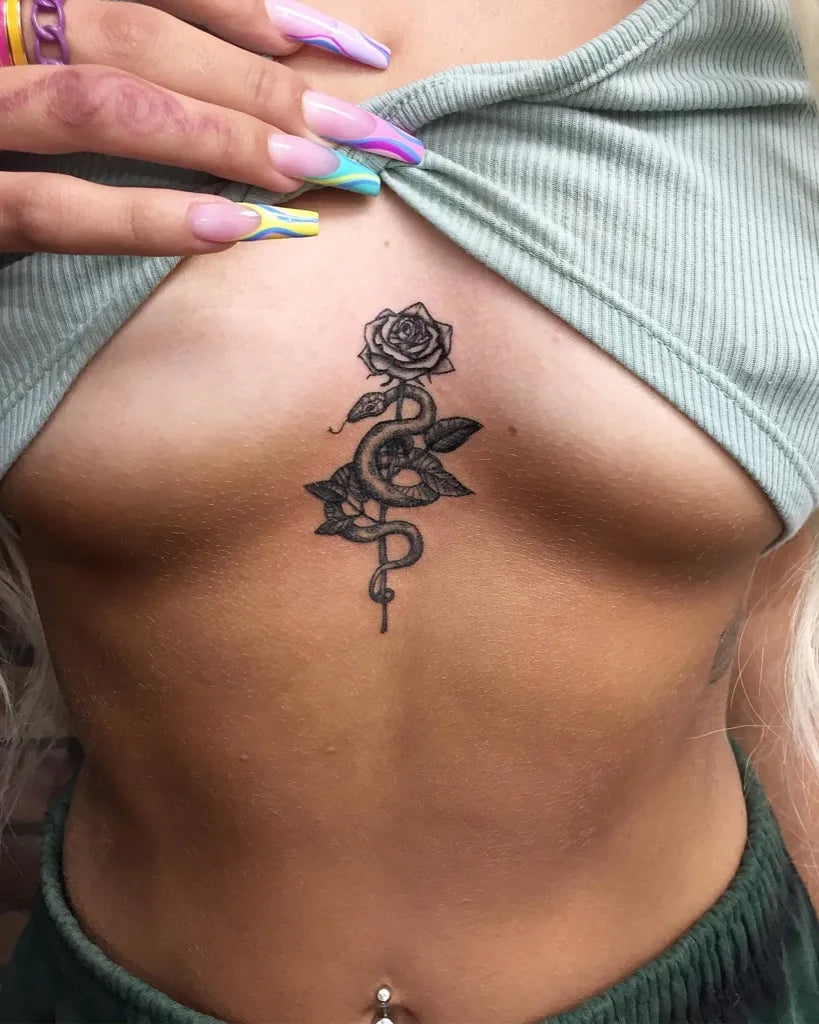 Small Neotraditional Rose and Snake on Women Sternum Tattoo by @steveohtattoo