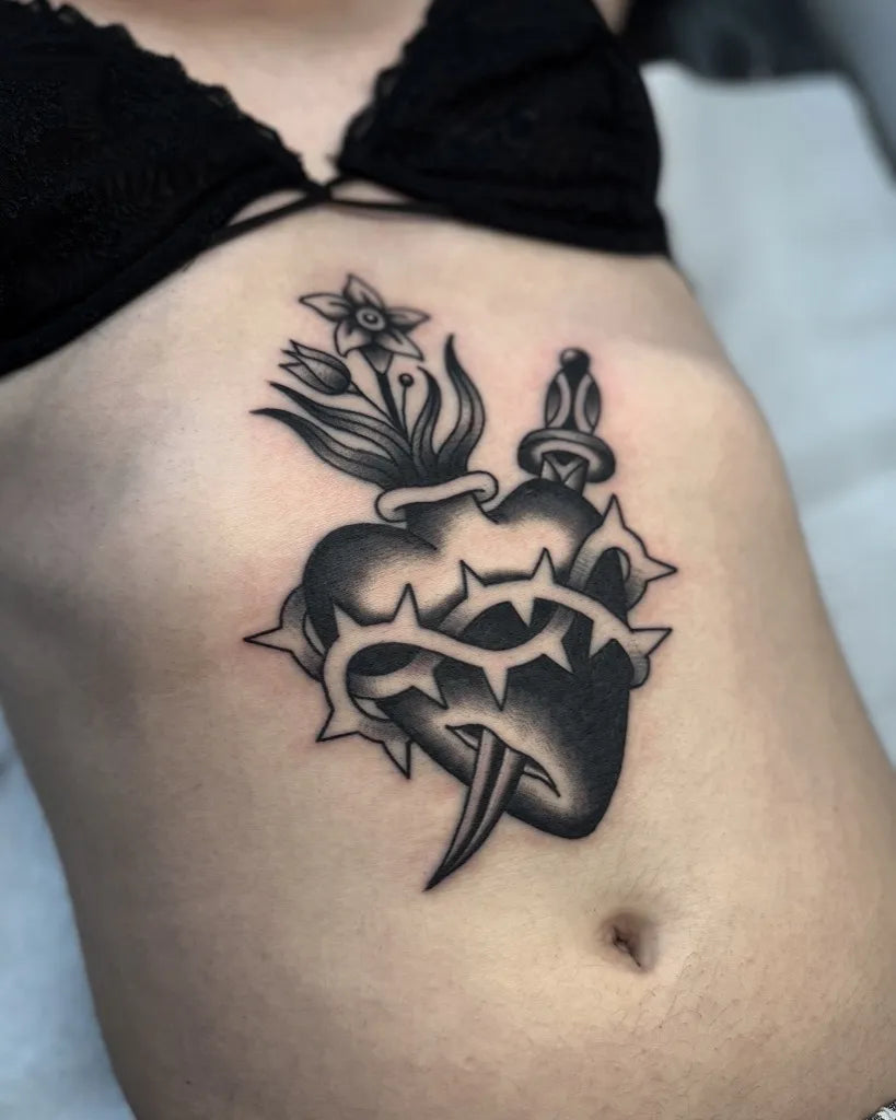 Small Traditional Sacred Heart on Women Sternum Tattoo by @alxgracia