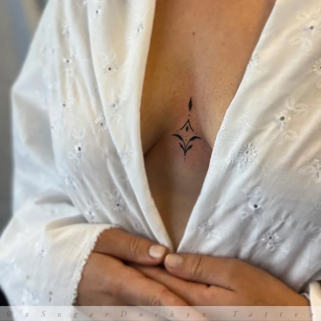 Tiny Minimalist Floral Flourish on Women Sternum Tattoo by @xsugarduckyx.tattoo