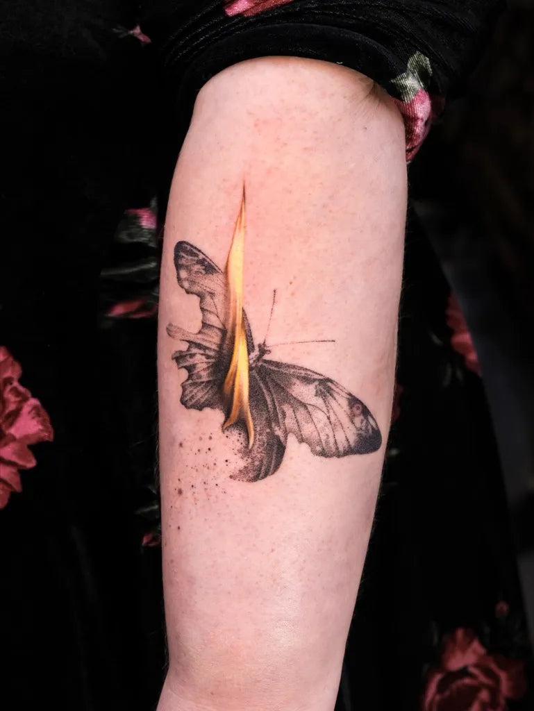 Medium Blackwork Butterfly with Flames Tattoo on Women Arm by @gogo_centuryink