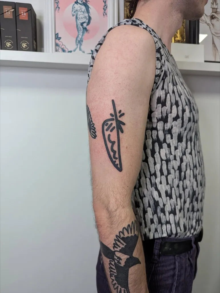 Medium Stick and Poke Feather and Crow Men Arm by @starttodaytattoo