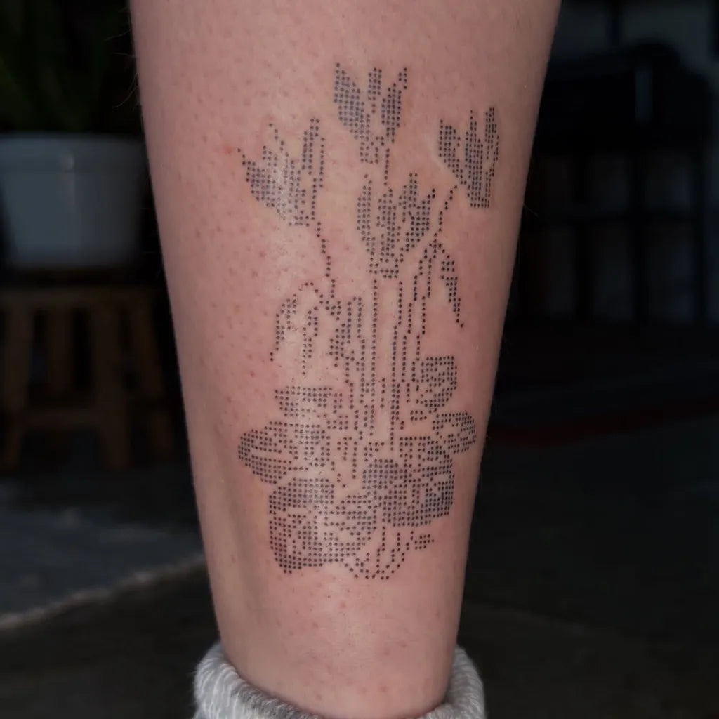 Medium Stick and Poke Violet Plant Tattoo on Women Leg by @olyviastattoos