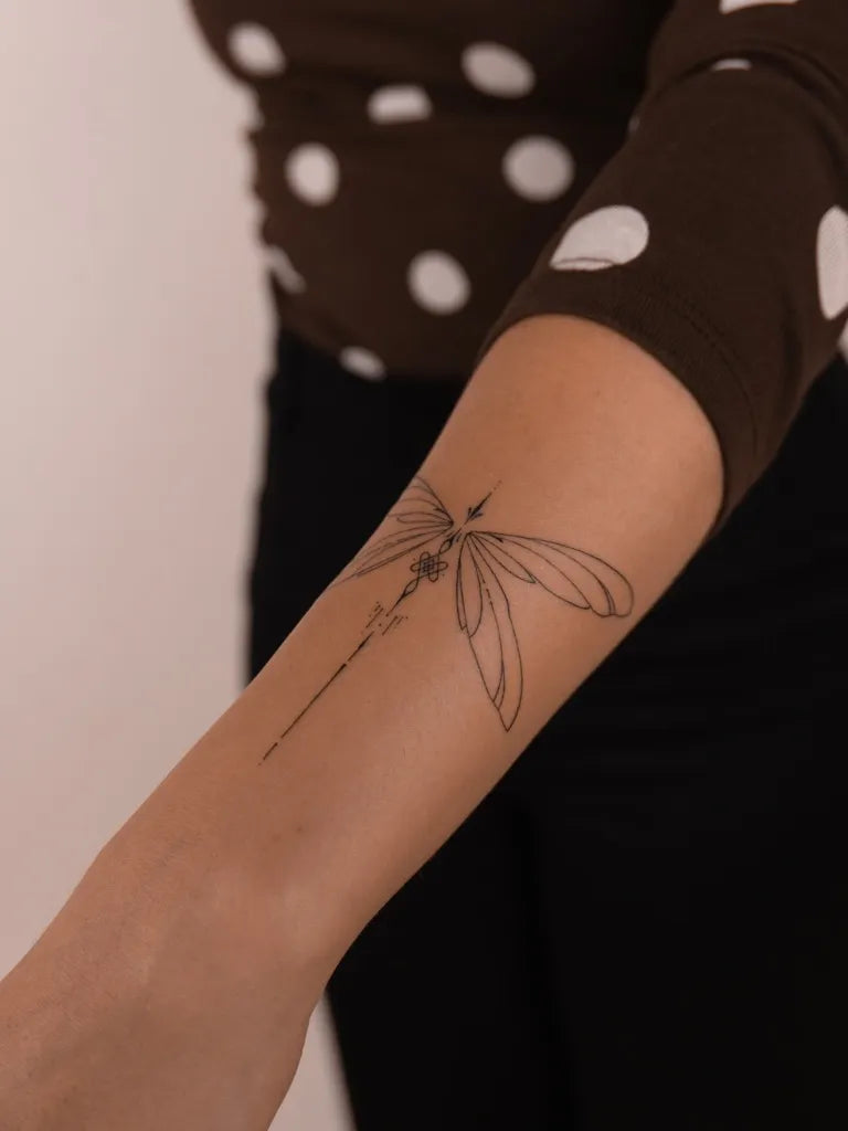 Small Stick and Poke Dragonfly Tattoo on Women Arm by @ann_pokes