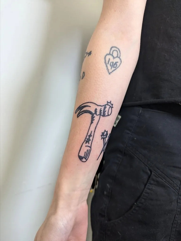 Small Stick and Poke Hammer and Sickle Tattoo on Men Arm by @starttodaytattoo