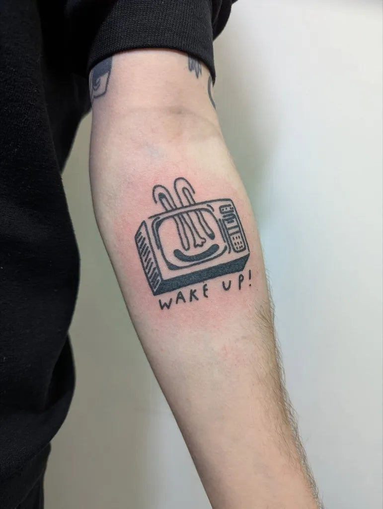 Small Stick and Poke Microwave with Wake Up Text Tattoo on Men Arm by @starttodaytattoo