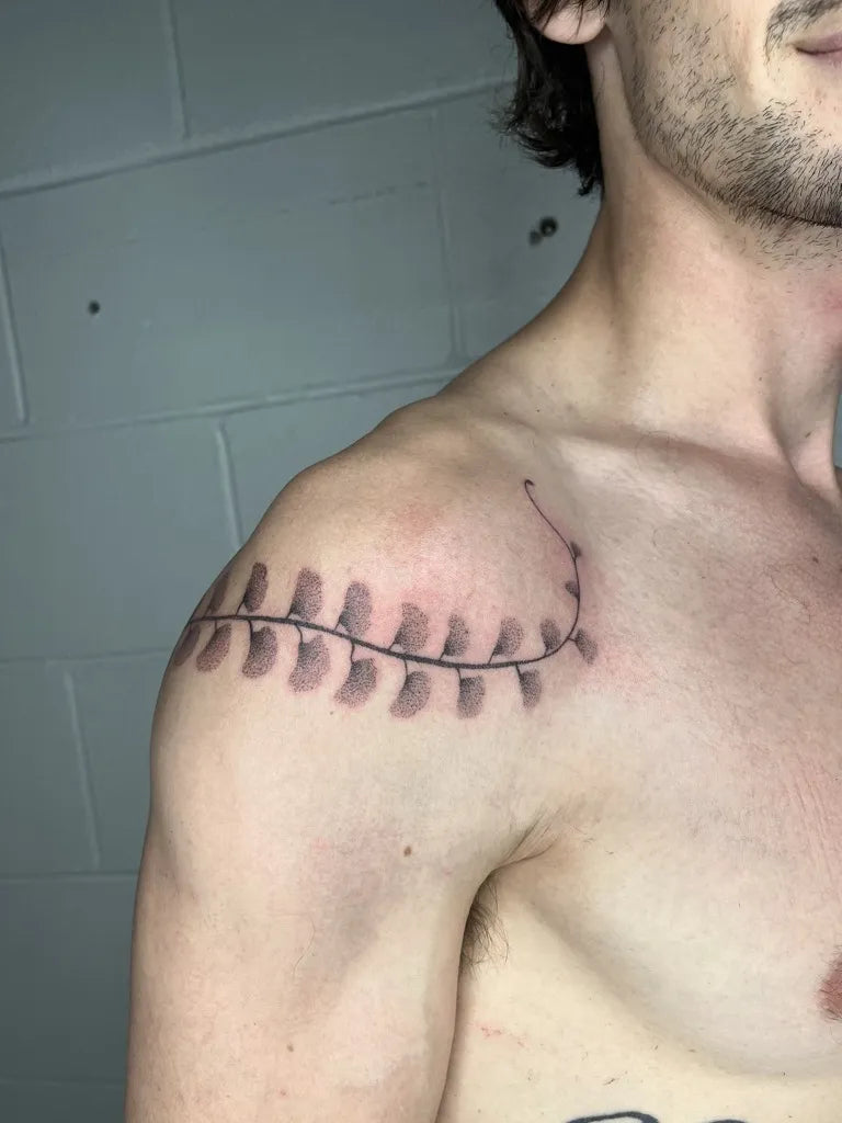 Small Stick and Poke Stitch Mark Tattoo on Men Shoulder by @_dirtfarm