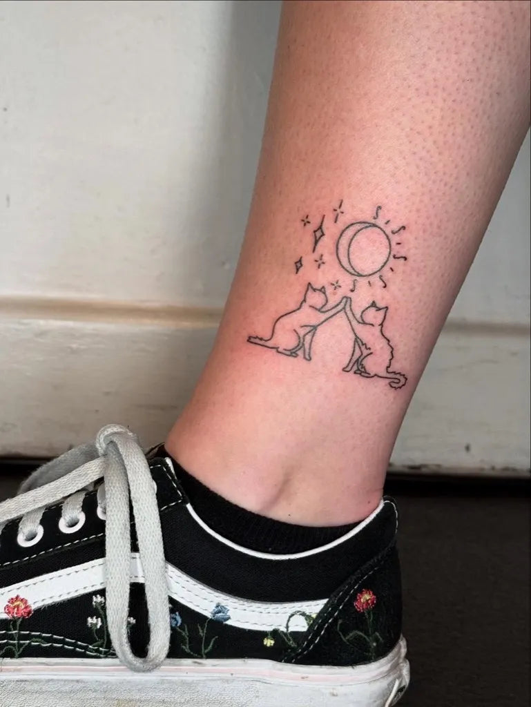 Small Stick and Poke Two Cats Moon Sun Tattoo on Women Ankle by @tattoosbyellie