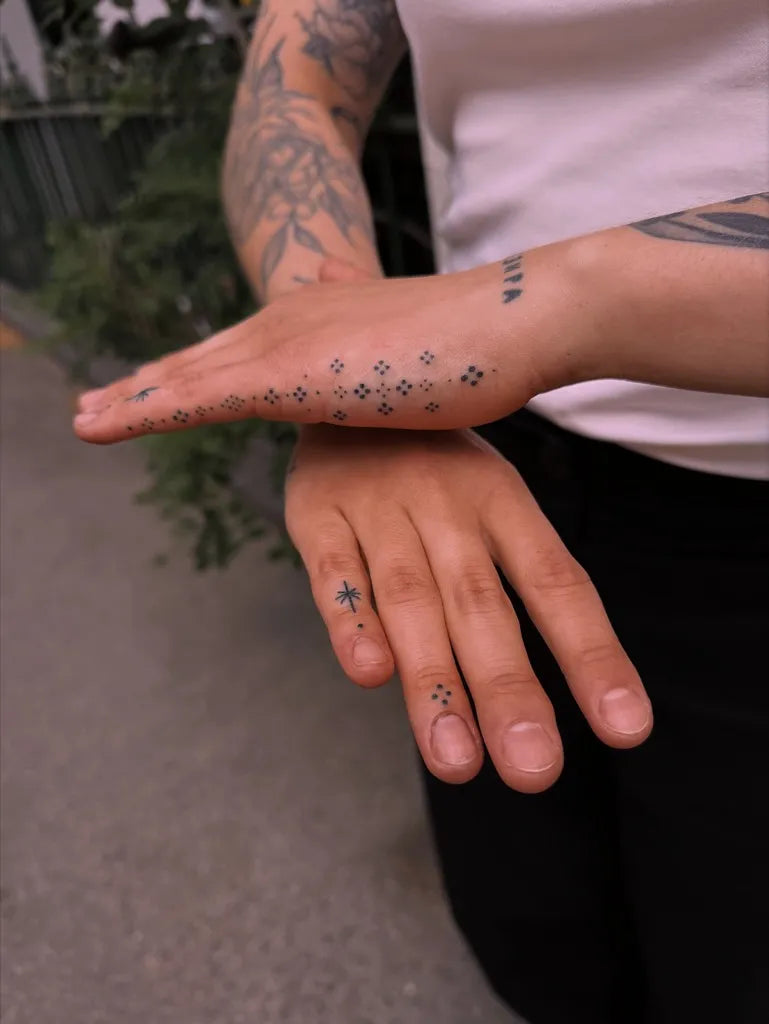 Tiny Stick and Poke Dots Tattoo on Women Hands by @slowpokes__