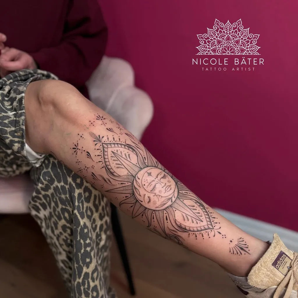 Big Fine Line Sun Moon Mandala on Women Leg Tattoo by @nicolebaetertattooartist