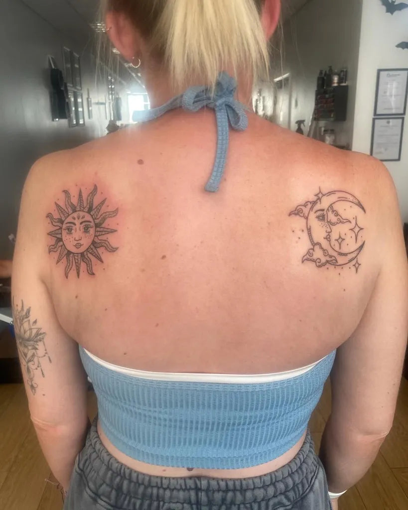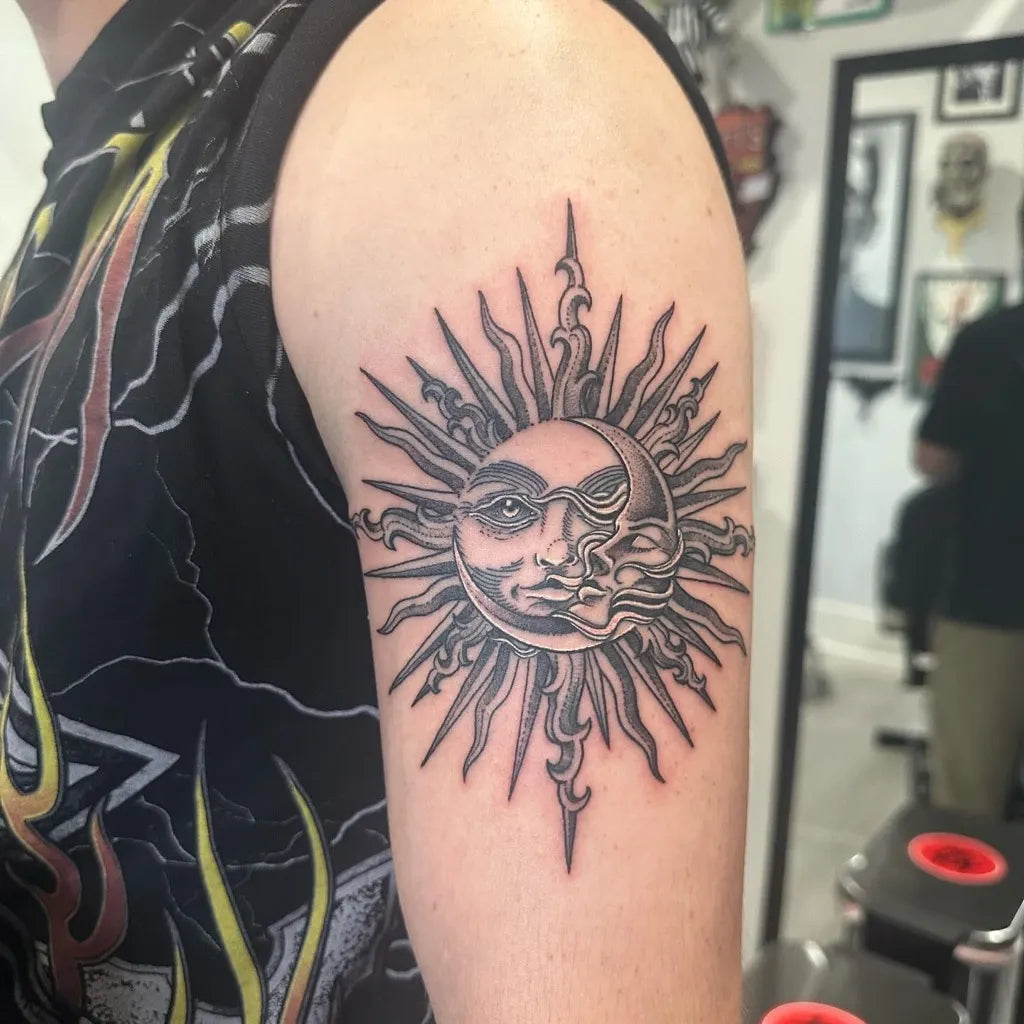Medium Blackwork Sun and Moon on Women Shoulder Tattoo by @highland.tattoos