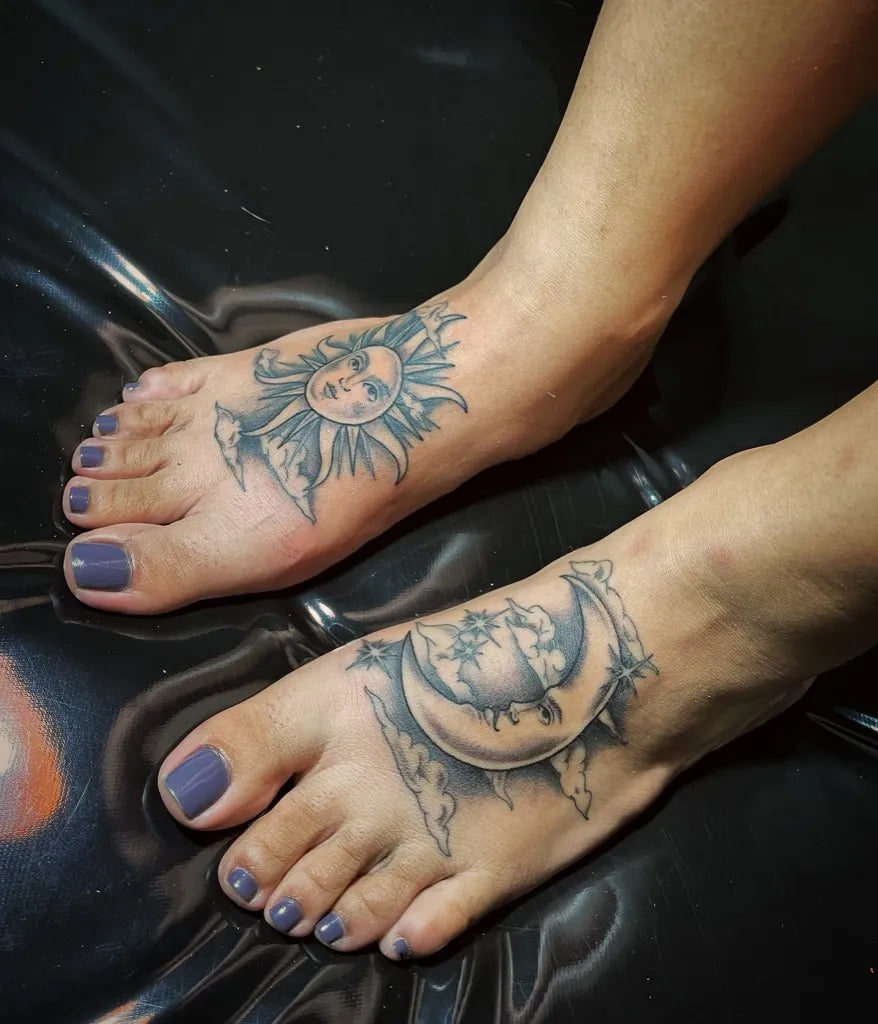 Medium Black and Grey Sun and Moon on Women Feet Tattoo by @vickytatts