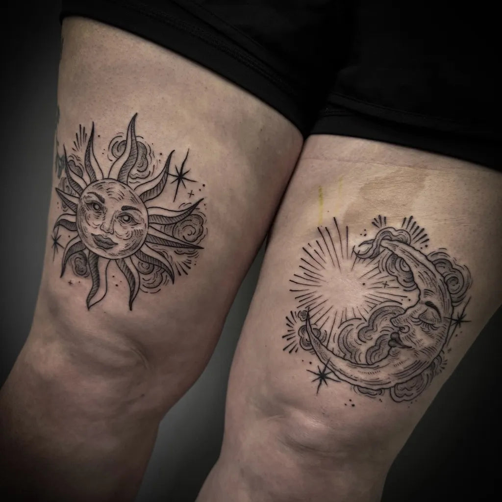 Medium Black and Grey Sun and Moon on Women Thigh Tattoo by @ameratattoo