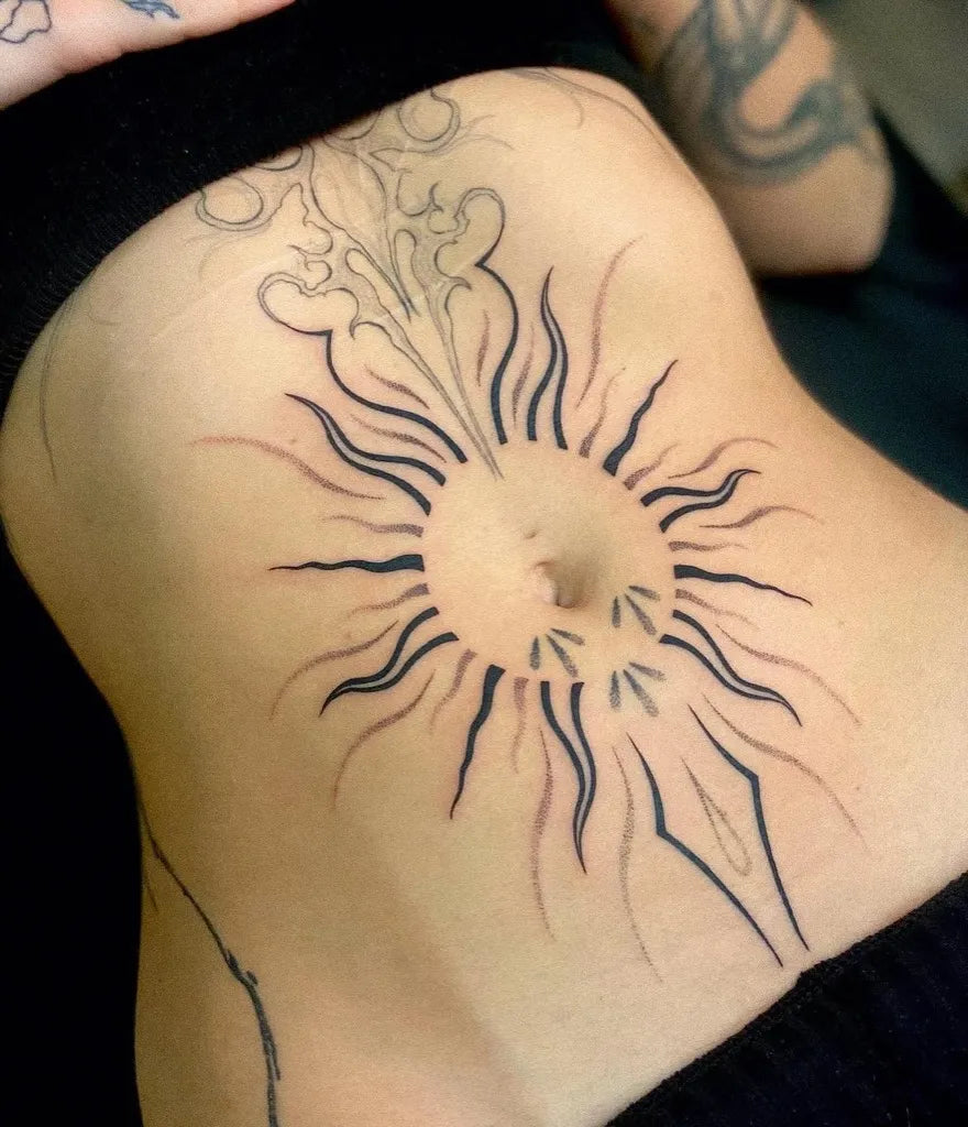 Medium Tribal Sun on Women Abdomen Tattoo by @kemp_ink