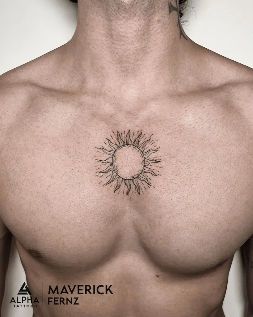 Small Black and Grey Sun on Men Chest Tattoo by @alphatattooindia