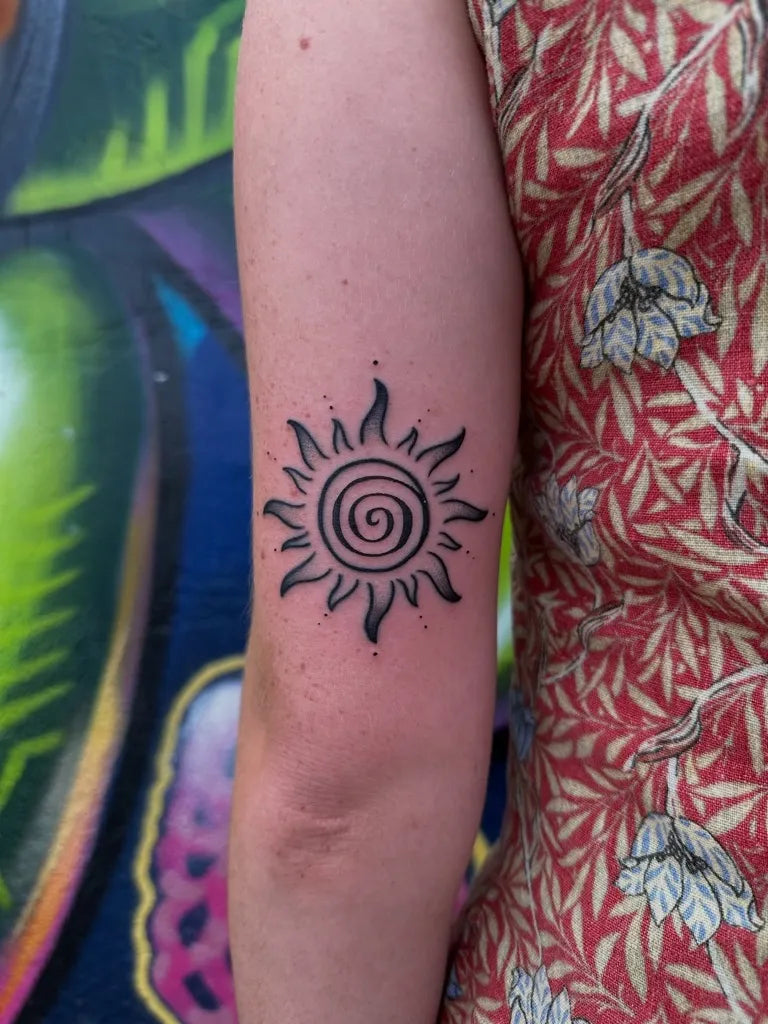 Small Minimalist Spiral Sun on Women Upper Arm Tattoo by @namaste_poke