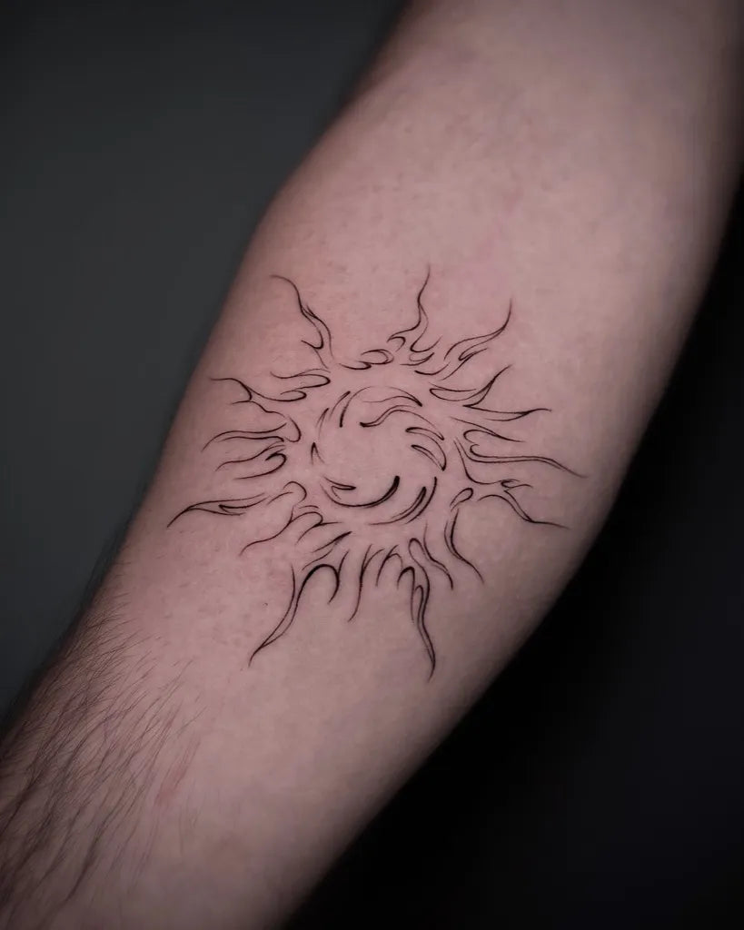 Small Linework Sun on Women Arm Tattoo by @tude.ink