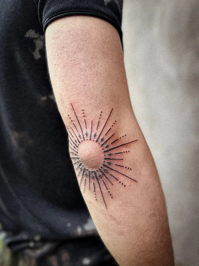 Small Dotwork Sun on Men Elbow Tattoo by @matahari.tattoo