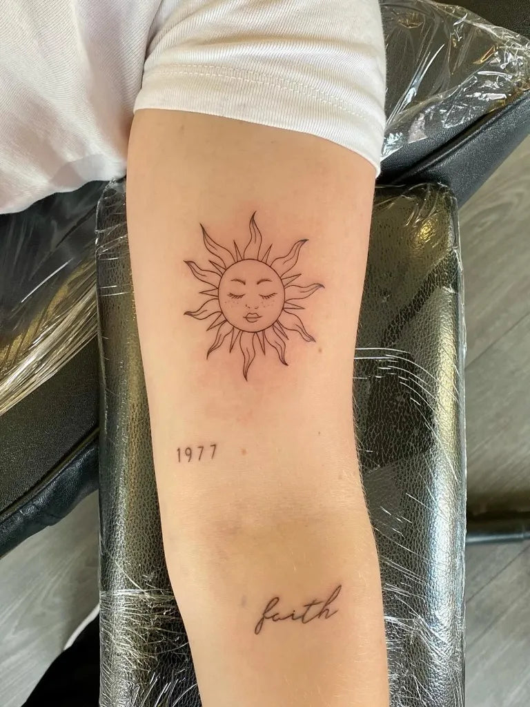 Small Fine Line Sun Faith 1977 on Women Arm Tattoo by @inkerella_tattoo