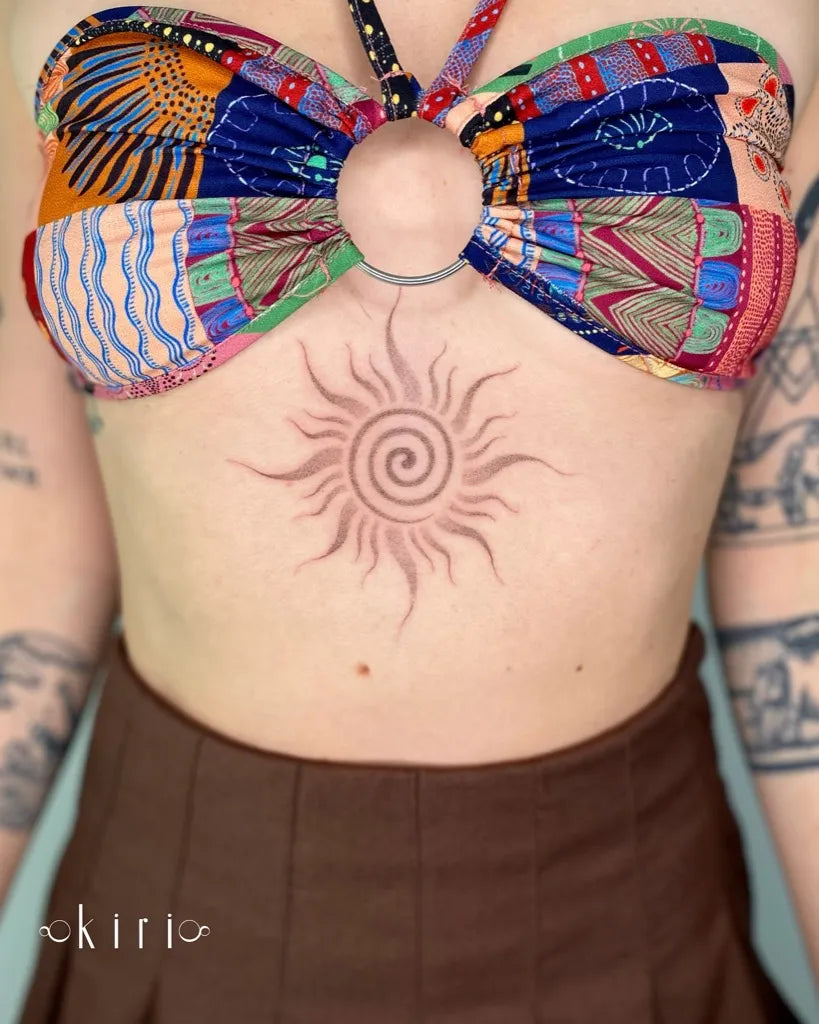 Medium Blackwork Sun on Women Chest Tattoo by @kiri.vrs