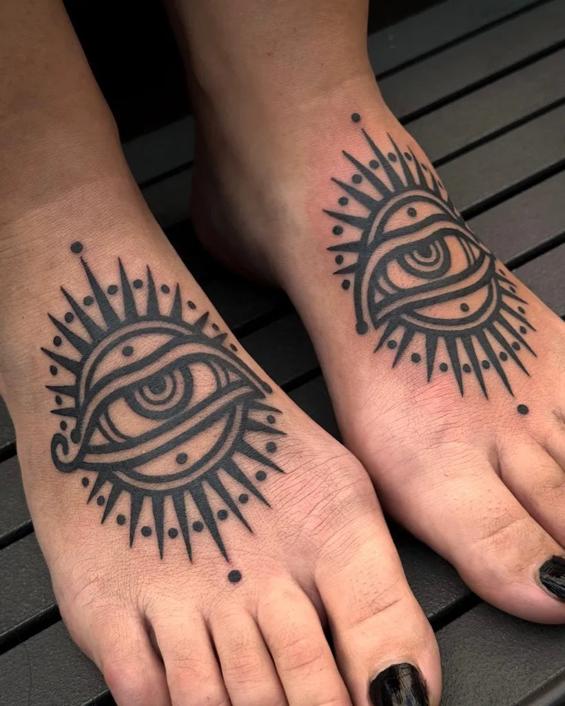 Small Blackwork Sun Eye on Women Feet Tattoo by @luxotattoox