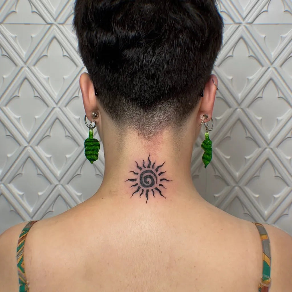 Small Blackwork Sun on Women Neck Tattoo by @jekoluan.tattoo