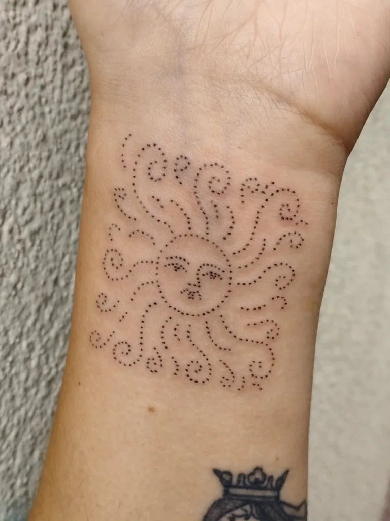 Small Dotwork Sun on Women Wrist Tattoo by @noalavande
