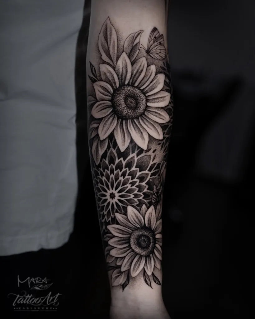 Medium Black and Grey Sunflower Mandala Butterfly on Women Arm Tattoo by @mara_tattooart
