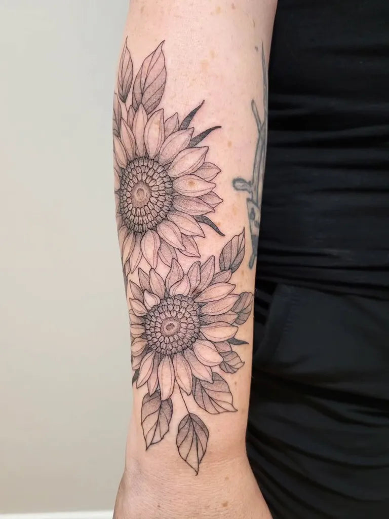 Medium Black and Grey Sunflowers and Leaves on Women Arm Tattoo by @little.mustard.ink