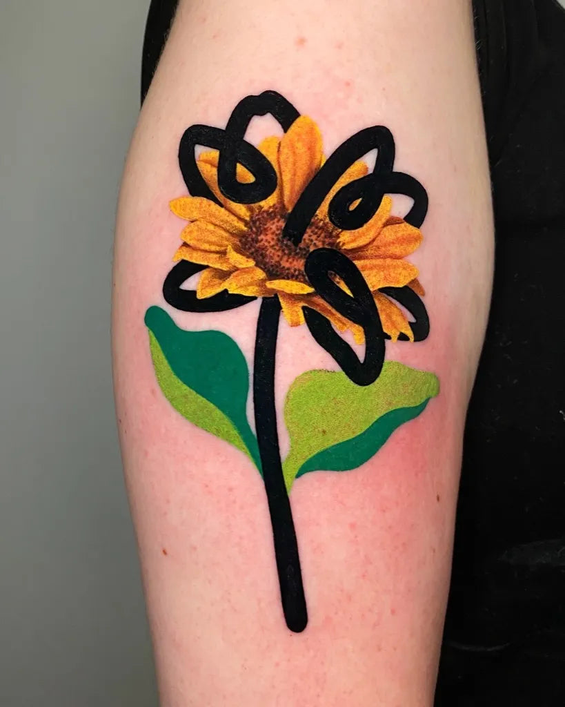 Medium Illustrative Sunflower on Women Arm Tattoo by @mambotattooer