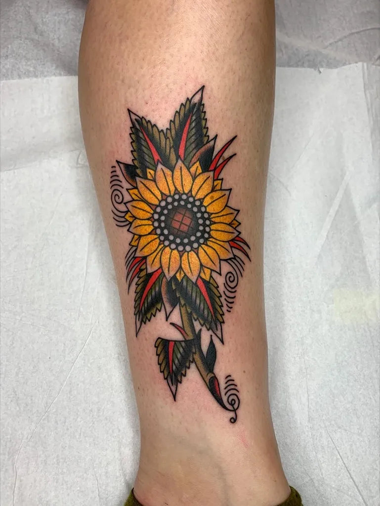 Medium Neo Traditional Sunflower Leaves on Women Leg Tattoo by @danhof.tattoos