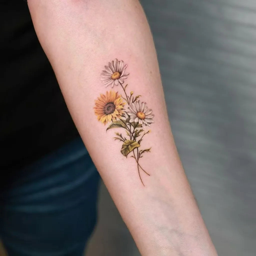 Small Fine Line Sunflower Daisies on Women Arm Tattoo by @inkparktattoo_kop
