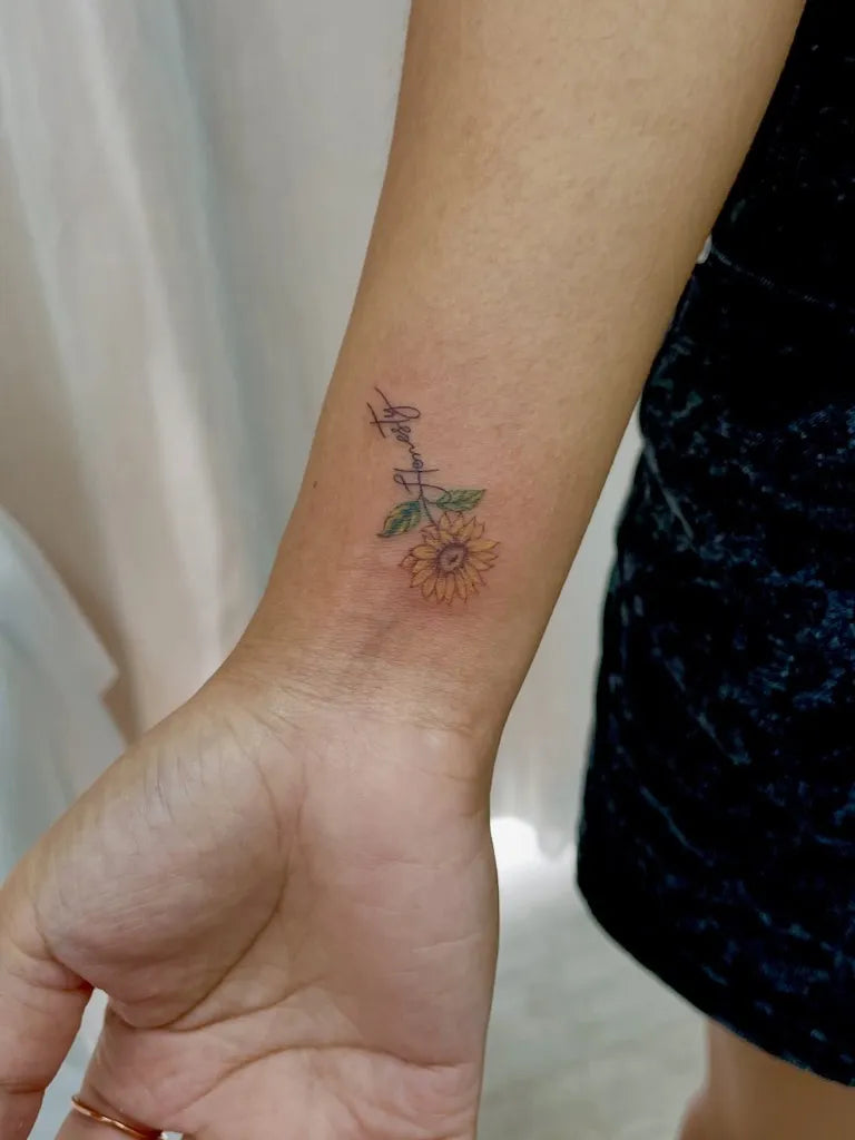 Small Fine Line Sunflower and Stem on Women Wrist Tattoo by @tattoo_thailand