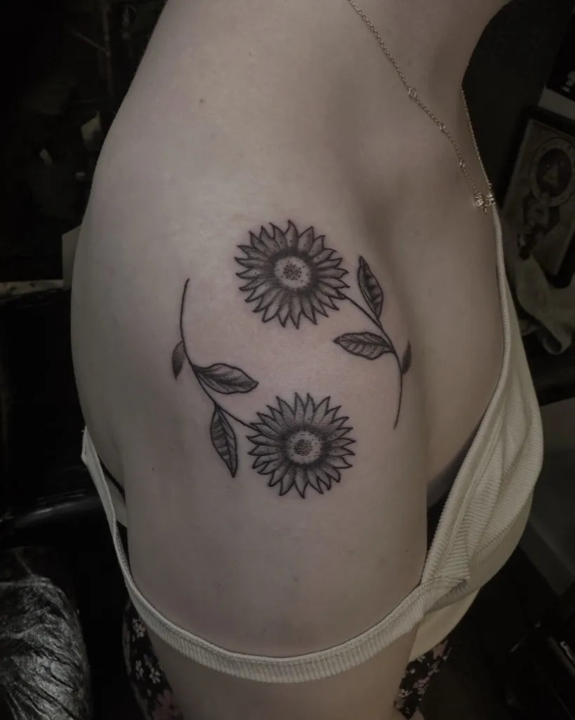 Small Linework Two Sunflowers with Leaves on Women Shoulder Tattoo by @antclaytattoo