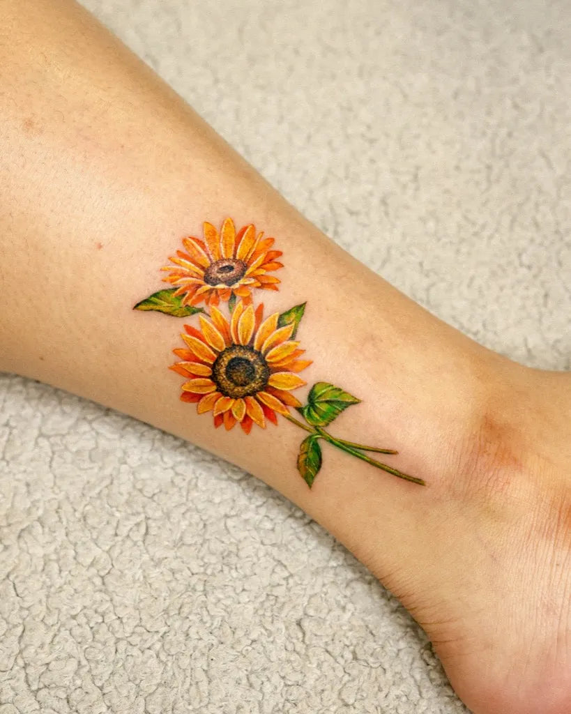 Small Watercolor Sunflowers on Women Ankle Tattoo by @_rony_tattoo