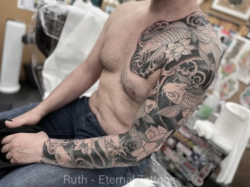 Big Japanese Koi Lotus Skull on Men Arm Tattoo by @eternaltattoos