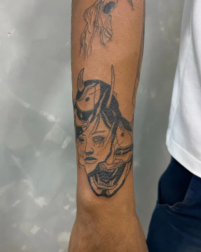 Medium Japanese Hannya Mask on Men Arm Tattoo by @pedro_romano_henrique