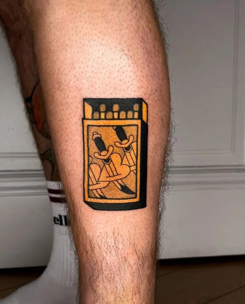 Small Neotraditional Matchbox with Knives on Men Calf Tattoo by @friedrich_heyden