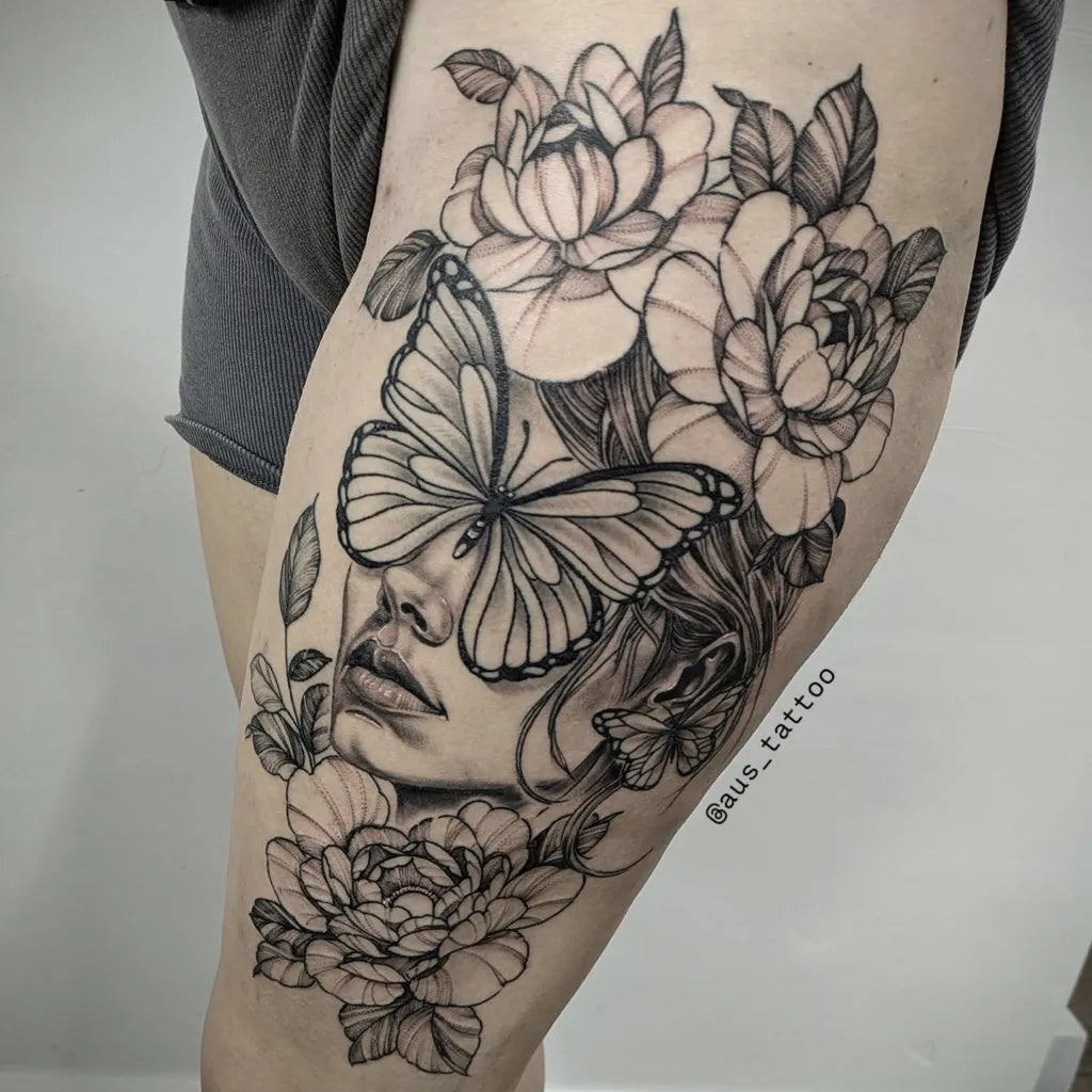 Big FineLine Woman with Flowers and Butterfly on Women Thigh Tattoo by @aus_tattoo