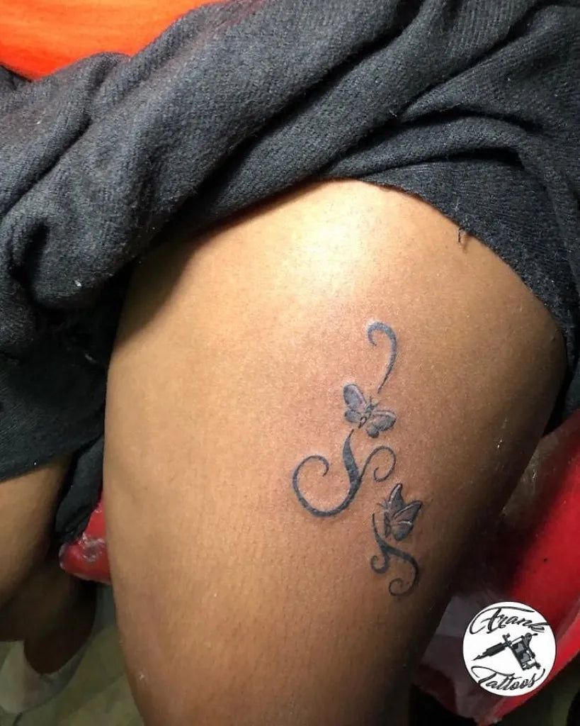 Small Minimalist Swirls Butterflies on Women Thigh Tattoo by @claatyfranklin