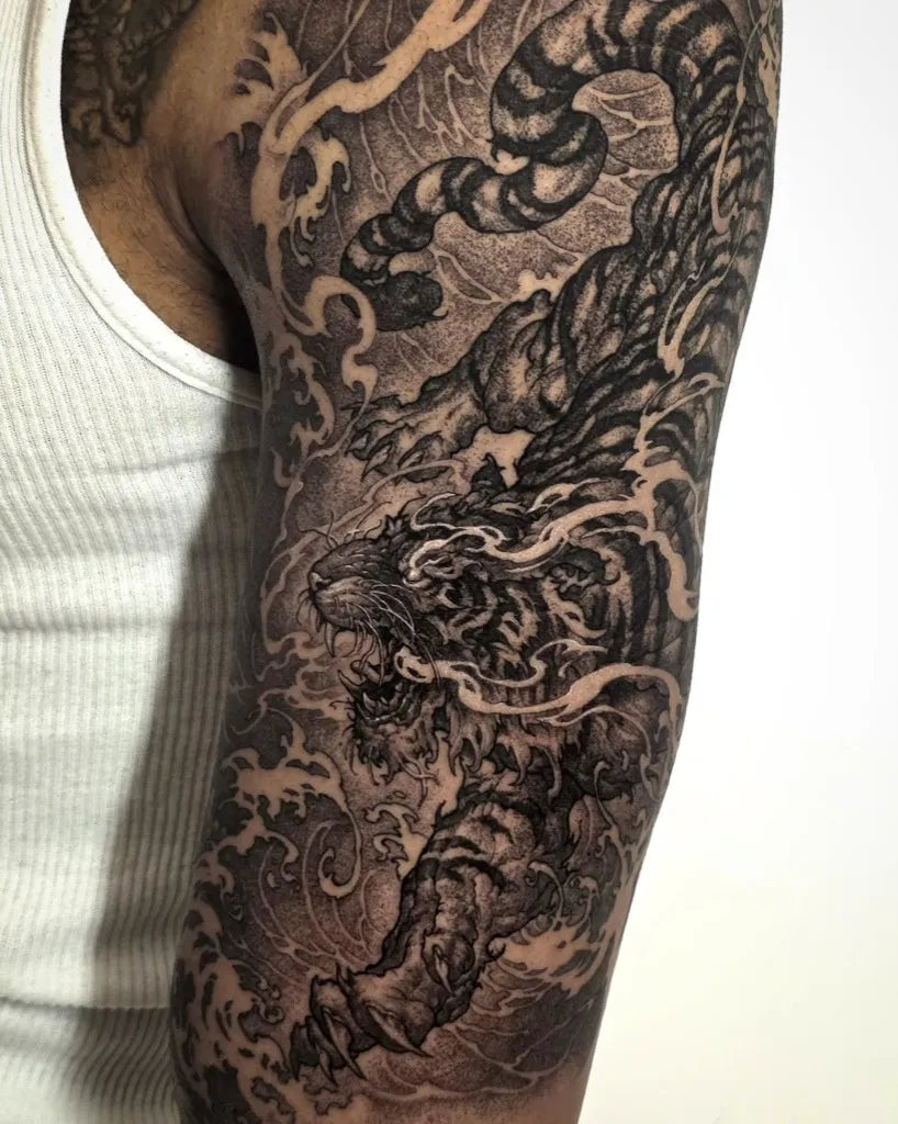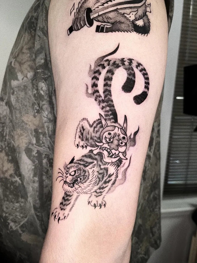 Big Japanese Tiger Fight on Men Arm Tattoo by @cang.dt