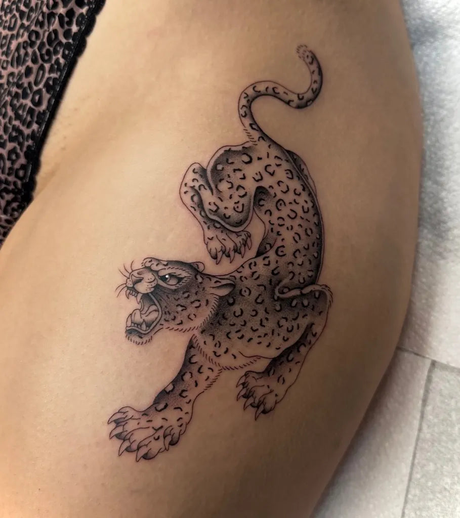 Medium Black and Grey Leopard on Women Thigh Tattoo by @lilymaytattoo