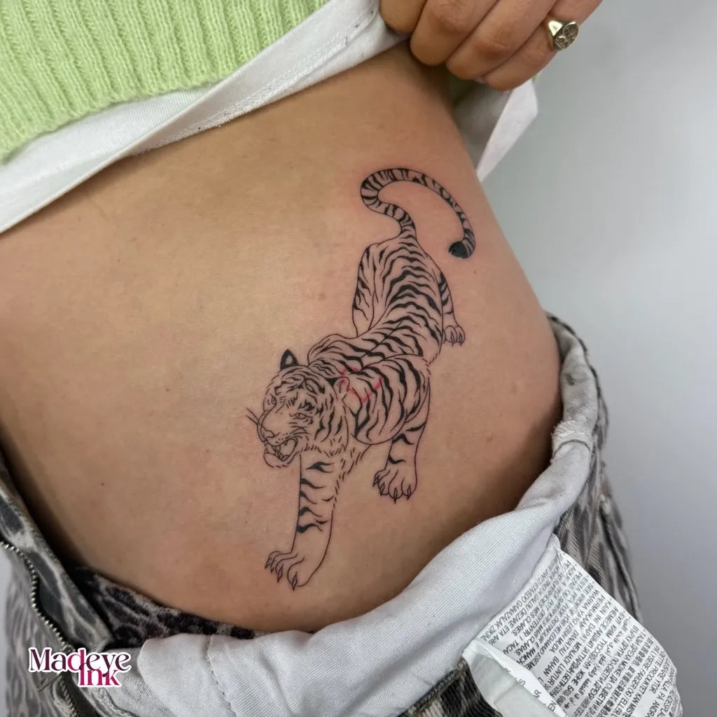 Medium Blackwork Tiger on Women Hip Tattoo by @madeye.ink