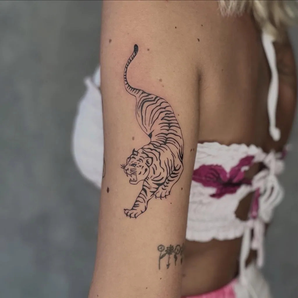 Small Linework Tiger on Women Arm Tattoo by @pierrotpokes