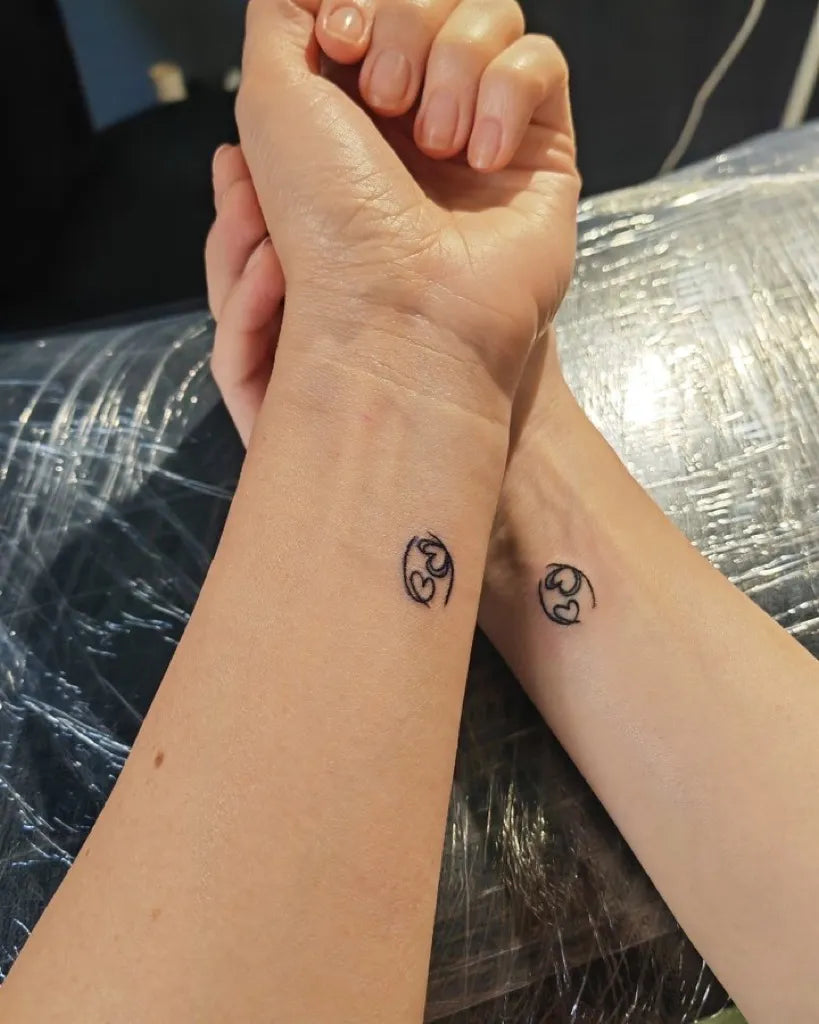 Tiny Minimalist Interlocking Hearts on Women Wrist Tattoo by @funky_tattoo_bucuresti