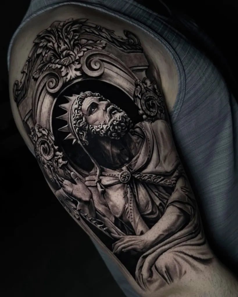Big Black and Grey Saint Portrait Tattoo on Men Upper Arm by @lamanigancetattootoronto