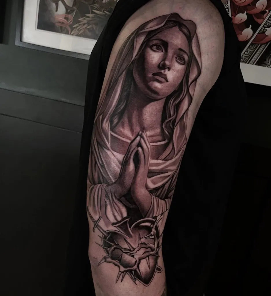 Big Black and Grey Virgin Mary with Sacred Heart Tattoo on Men Upper Arm by @hannahmcque.tattoo