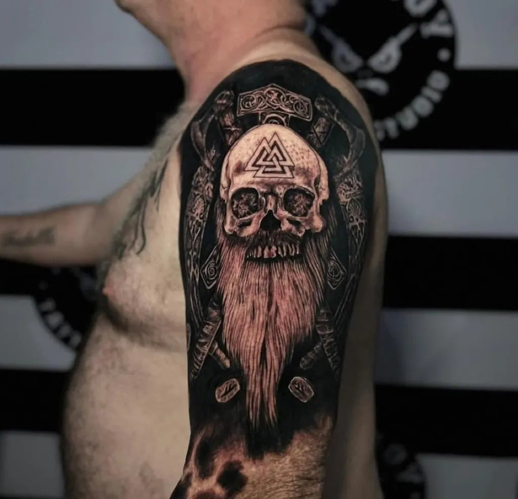 Big Blackwork Valknut Skull Tattoo on Men Upper Arm by @badboytattoostudio
