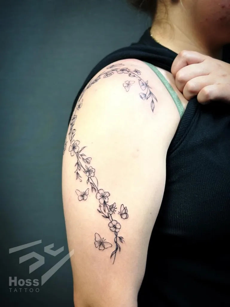 Medium Blackwork Flowers and Butterflies Tattoo on Women Upper Arm by @hoss.tattoo