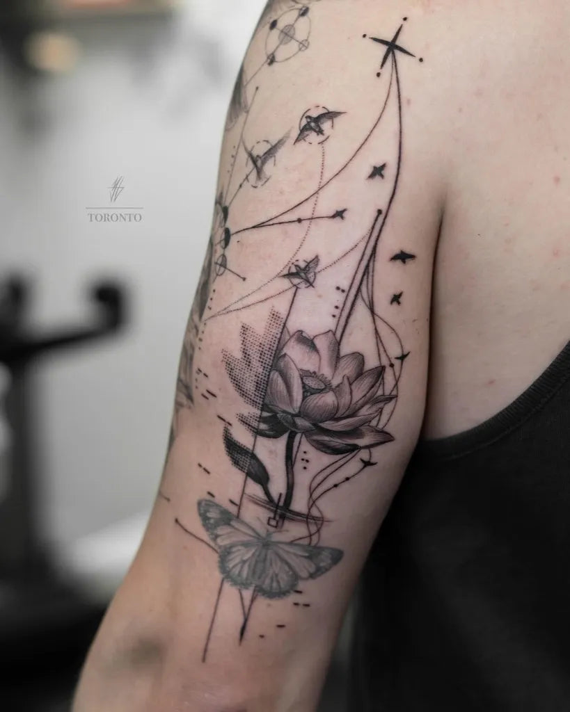 Medium Blackwork Lotus Flower Butterfly Tattoo on Women Upper Arm by @yptattoos