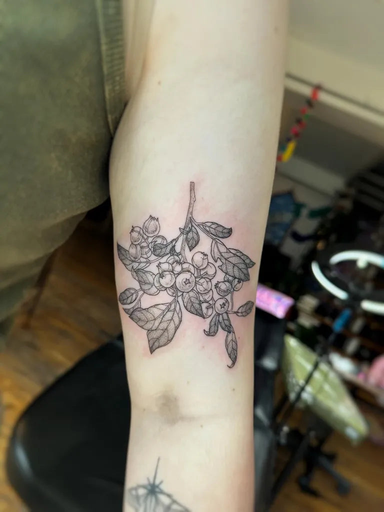 Small Black and Grey Blueberry Branch Tattoo on Women Upper Arm by @valvntin